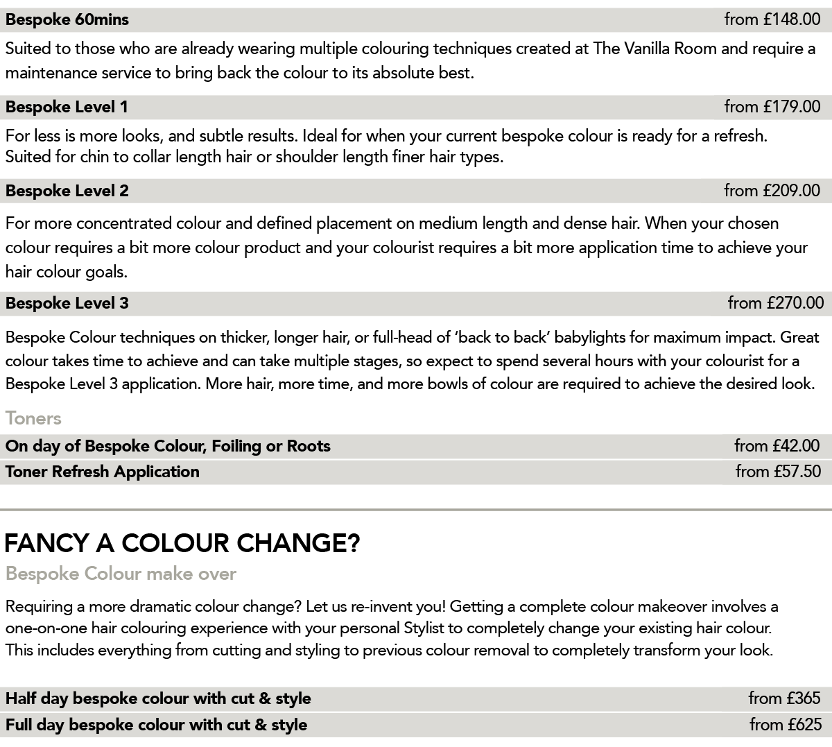 At The Vanilla Room, each client’s hair colour is unique. With this in mind our prices are approximate and may change following your initial consultation and our smart scale colour bar system.