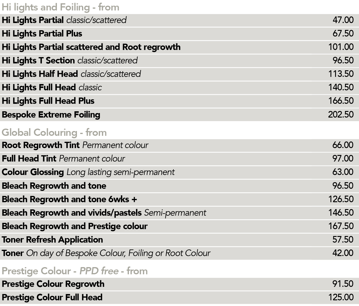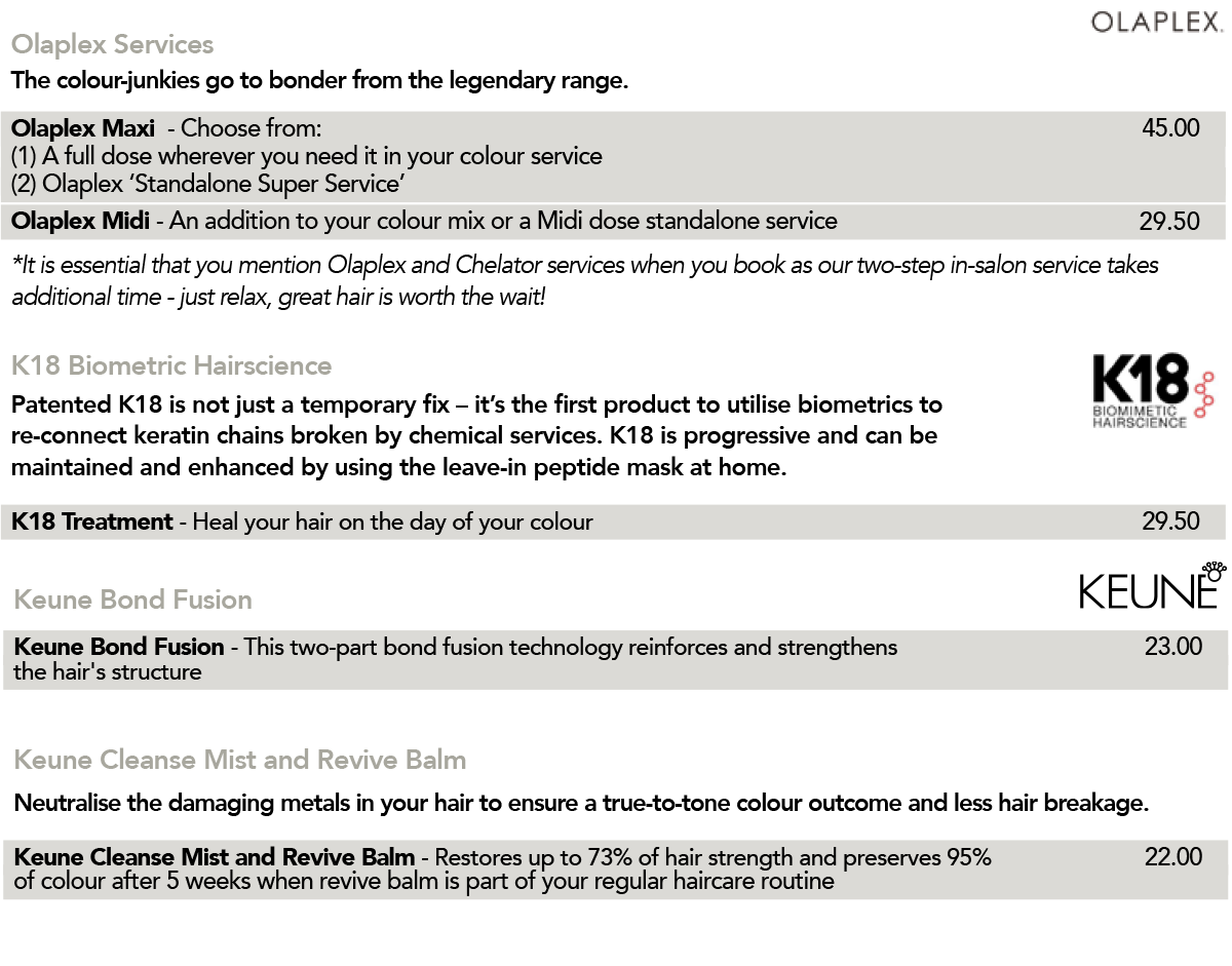 Hair colour prices are non-inclusive of cutting and styling.